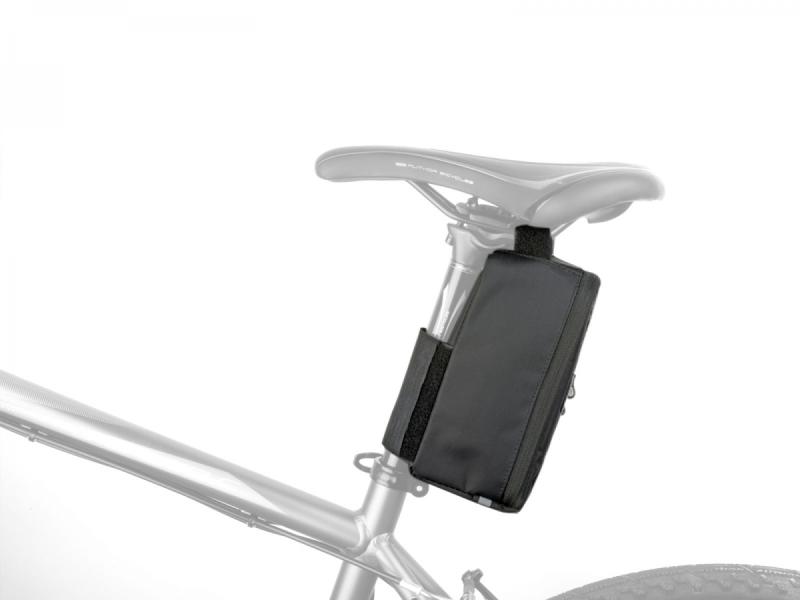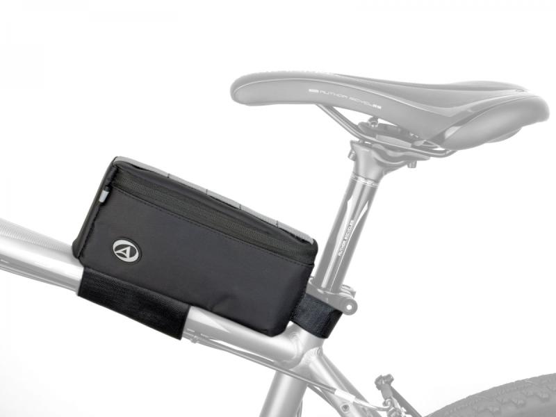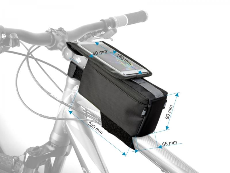 - Hlavní upínací popruh je opatřen suchým zipem a vnitřním silikonovým potiskem, díky kterému brašna pevně drží na rámu a neklouže.