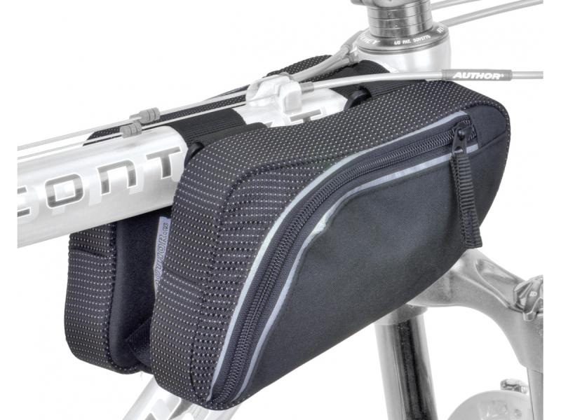 Tato dvojitá brašna je navržena pro upevnění na přední část rámu kola a nabízí univerzální uchycení, které pasuje na většinu typů rámů. Disponuje dvěma samostatnými polstrovanými kapsami, každá s objemem 0,6 l, což umožňuje přehledné a bezpečné uskladnění drobných předmětů během jízdy.