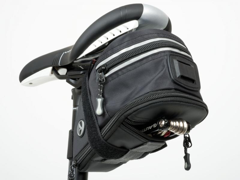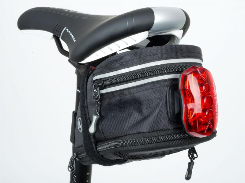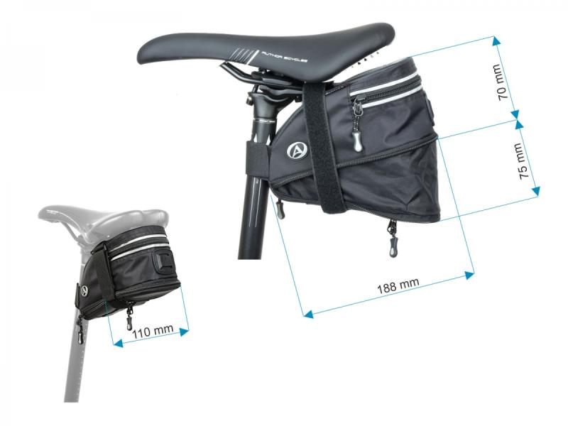 Univerzální brašna pod sedlo s nastavitelným objemem, voděodolným materiálem a reflexním lemováním pro bezpečné a praktické uložení nářadí i drobností.