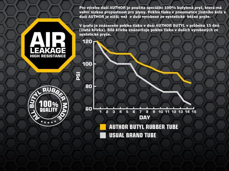 Duša vyrobená z 100% butylovej gumy ponúka veľmi nízku priepustnosť pre plyny, čo znamená, že tlak vzduchu v pneumatike vydrží dlhšiu dobu bez potreby častého dohušťovania v porovnaní s dušami zo syntetickej gumy.