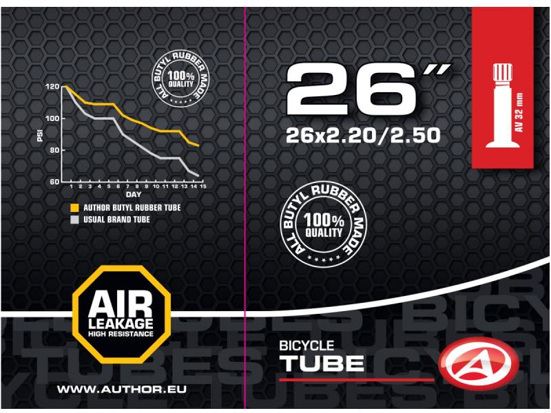 Duša AUTHOR 26x2.20-2.50 je vyrobená zo 100% butylovej gumy, ktorá zabezpečuje veľmi nízku priepustnosť plynov, vďaka čomu udrží tlak vzduchu v pneumatike dlhšie ako duše zo syntetických materiálov. Tento materiál prispieva k lepšej výdrži vzduchu a tým aj k pohodlnejšej jazde bez častého dohušťovania.