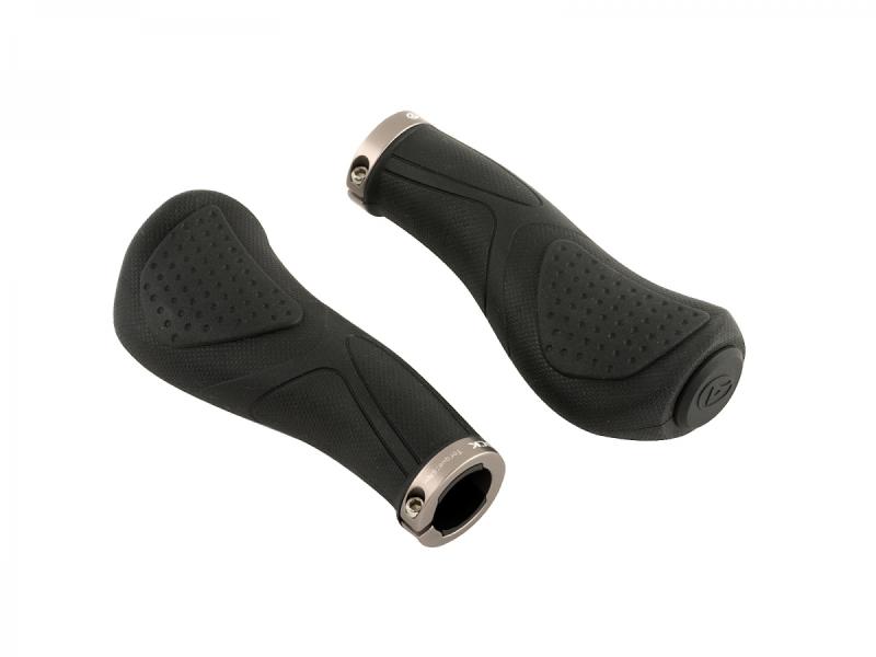 Gripy jsou vyrobeny z pryžového D2 materiálu, který nabízí příjemný povrch a dostatečnou přilnavost. Konstrukce je vyztužená plastovým tělem s duralovou pojistnou objímkou, která zajišťuje pevné uchycení gripu na řídítkách a zabraňuje jeho nežádoucímu posunu během jízdy.