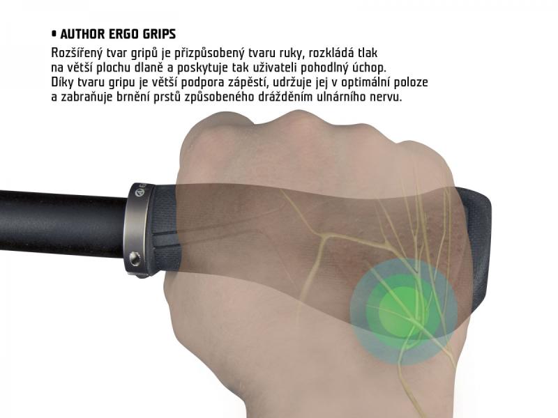 Ergonomické gripy AUTHOR R55 jsou navrženy pro velmi pohodlný úchop a podporu rukou během jízdy na kole. Křídlový tvar gripu dokonale kopíruje přirozený tvar ruky, čímž rozkládá tlak na větší plochu dlaně a zajišťuje tak komfortní držení řídítek. Tento tvar zároveň pomáhá udržet zápěstí v optimální poloze, což významně snižuje jeho zatížení a přispívá k prevenci brnění prstů.