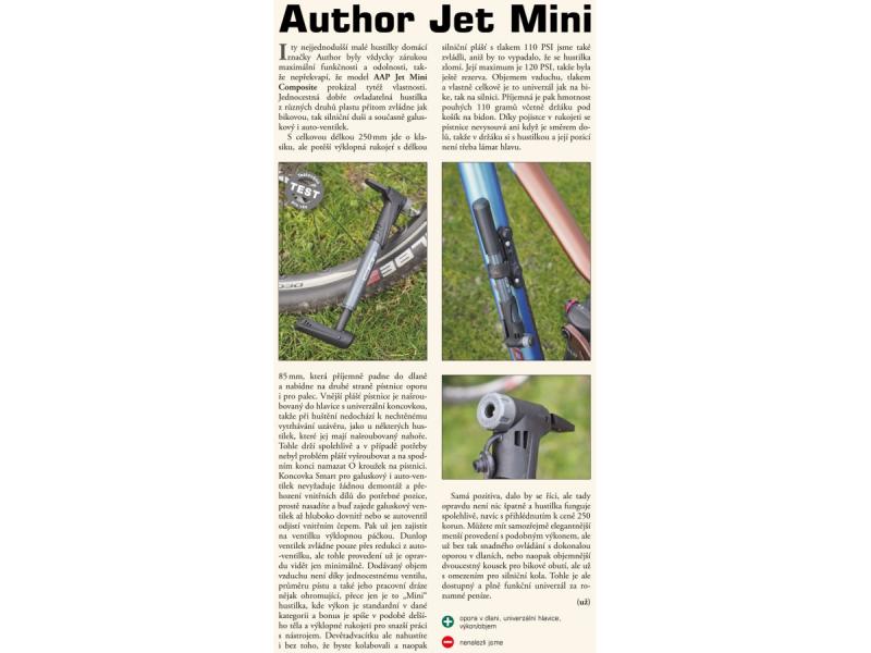 Hustilka AUTHOR Jet Mini Composite nabízí rychlé a pohodlné nahuštění pneumatik, a to díky své kompaktní velikosti a nízké hmotnosti. Maximální tlak, kterého lze dosáhnout, je 120 PSI (0,83 MPa), což je dostatečné pro většinu jízdních kol. Díky nové SMART hlavě je možné hustit jak galuskový ventil (FV), tak autoventil (AV), což zjednodušuje použití bez nutnosti měnit koncovky.