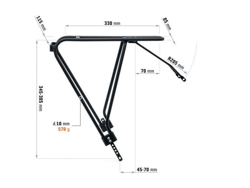Použitý materiál AL6061-T6 s trubičkami o průměru 10 mm zajišťuje dostatečnou pevnost při nízké hmotnosti. Horní ložná plocha má rozměry 330 x 85-115 mm, což umožňuje stabilní upevnění nákladu.