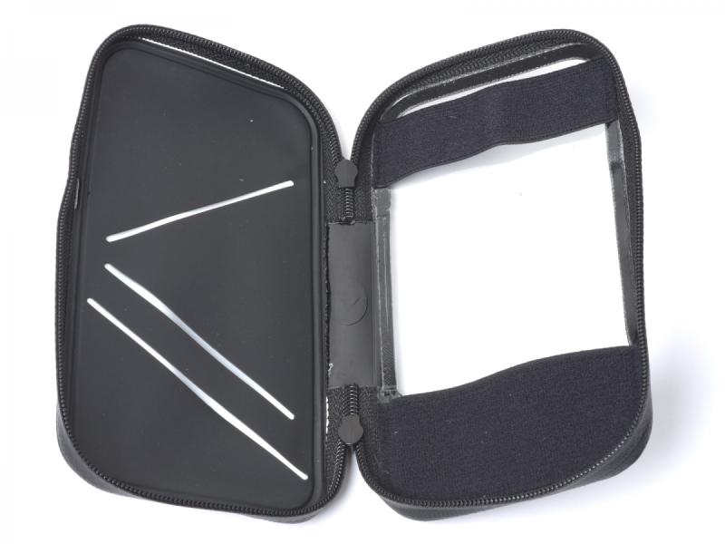 Pouzdro na telefon s vyztužením a univerzálním držákem pro snadné upevnění pod krytku hlavového složení. Vnitřní rozměr 135 × 70 mm.