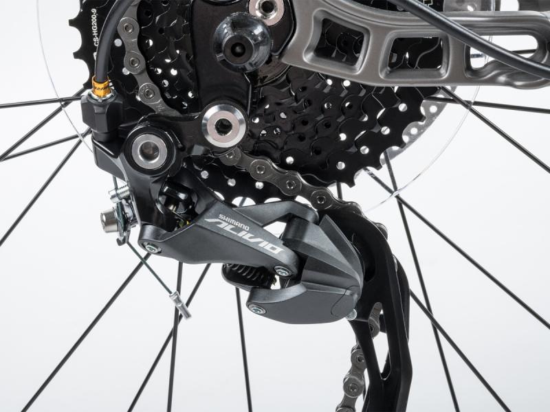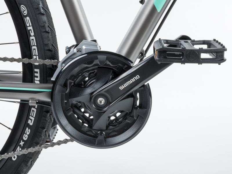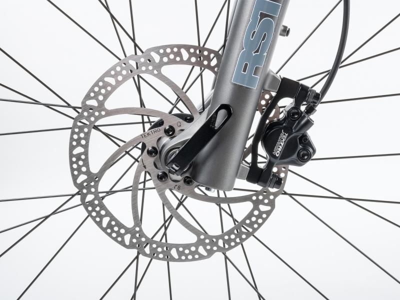 Řazení je řešeno sadou Shimano Alivio s 27 rychlostmi (3×9), která je známá svou spolehlivostí a přesností. Pro bezpečné zastavení slouží hydraulické kotoučové brzdy Tektro, které poskytují účinný brzdný výkon i za mokra nebo v náročnějším terénu. Kolo je vybaveno značkovými plášti Vittoria s nízkým valivým odporem, což usnadňuje jízdu a zvyšuje efektivitu šlapání.