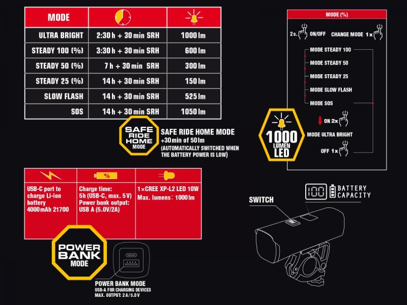 Funkce Safe Ride Home automaticky přepne světlo do úsporného režimu při nízké kapacitě baterie, čímž zajistí dalších 30 minut svícení pro bezpečný návrat domů. Díky Smart Memory vypínači se světlo zapíná vždy ve stejném režimu, ve kterém bylo vypnuto, což usnadňuje obsluhu.