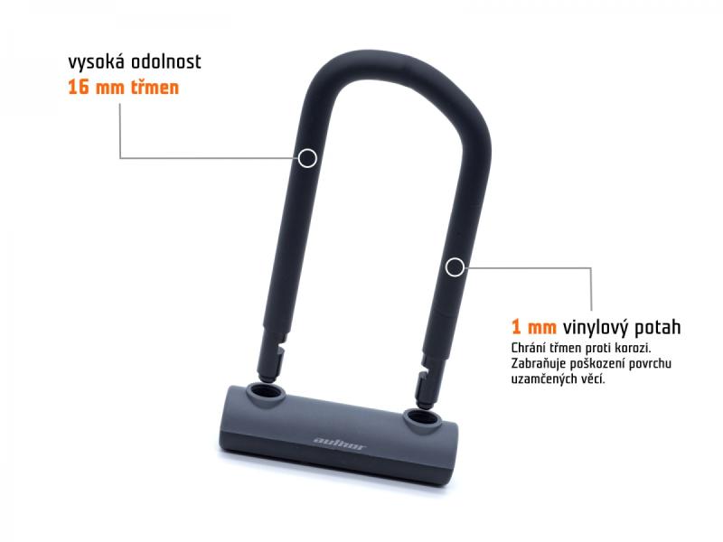 Cyklistický U zámok ponúka spoľahlivú ochranu vďaka špeciálnemu tvaru strmeňa a vinylovému povlaku, ktorý je odolný voči vode, prachu aj nečistotám. Súčasťou balenia je oceľové lano a držiak s nastaviteľnými objímkami, ktoré umožňujú jednoduché pripevnenie na rám bicykla alebo sedlovku. Odolnosť tohto zámku je potvrdená nezávislou holandskou laboratóriou ART, ktorá mu udelila certifikáciu 2 STARS.