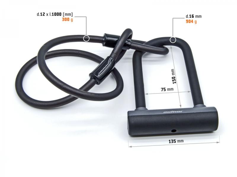 Vysoká odolnosť proti prestrihnutiu, prerezaniu, mechanickému poškodeniu a vŕtaniu výrazne znižuje riziko krádeže a zabezpečuje dlhodobú ochranu. Parametre U-zámku sú 205 x 135 mm s priemerom strmeňa 16 mm (strmeň dĺžky 14 mm) a hmotnosť 904 g. Oceľové lano má vonkajší priemer 12 mm (pramenné lano s jadrom o priemere 8 mm), dĺžku 1 m, hmotnosť 300 g a je vybavené dvoma pevnými očkami.