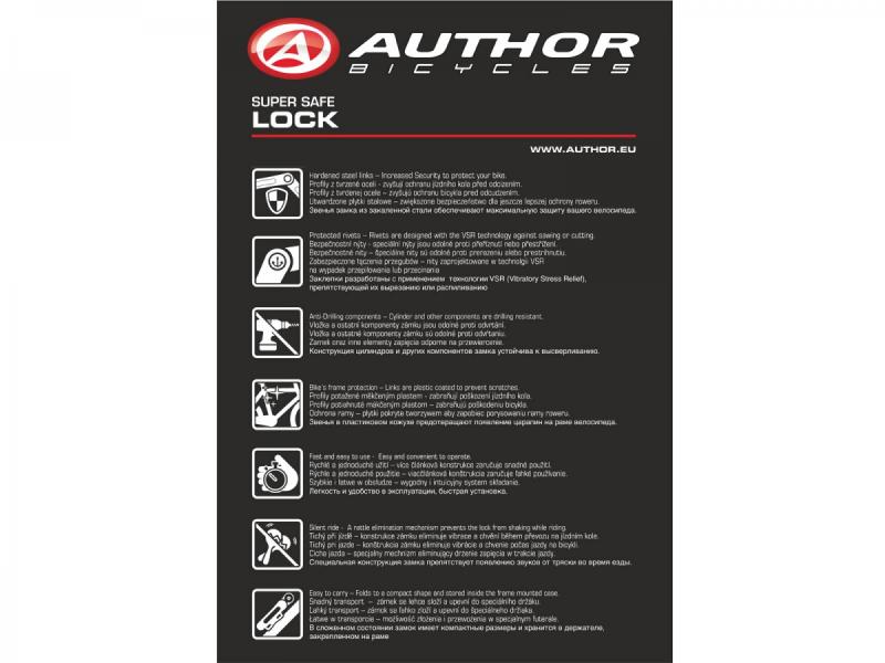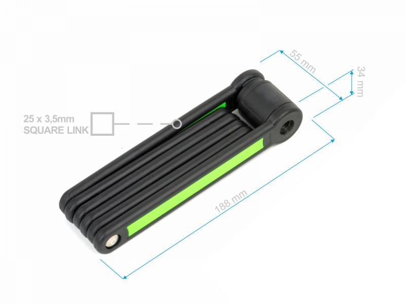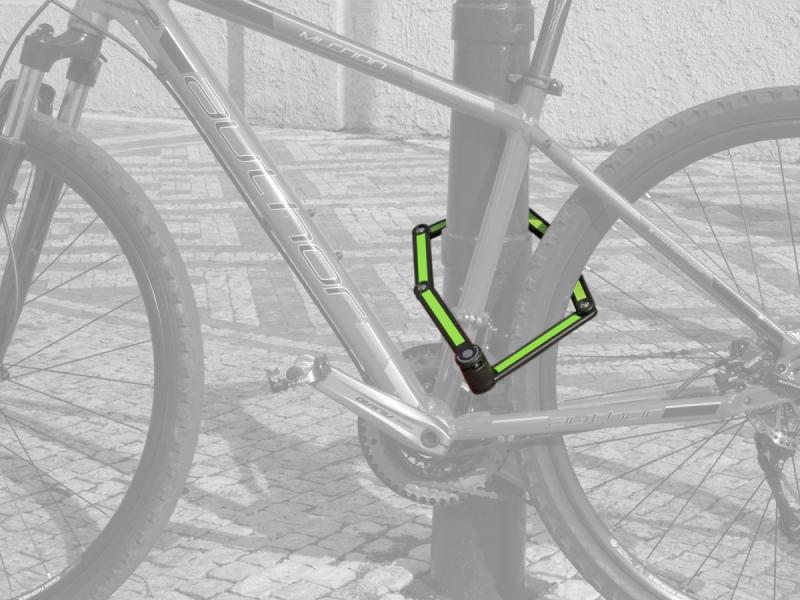 Ocelové profily o tloušťce 3,5 mm jsou potažené měkčeným plastem, což zabraňuje poškození laku kola a zároveň zvyšuje odolnost zámku. Šest článků zámku umožňuje jednoduché a rychlé skládání i rozkládání, což oceníte při každodenním používání.