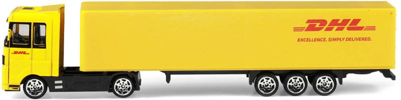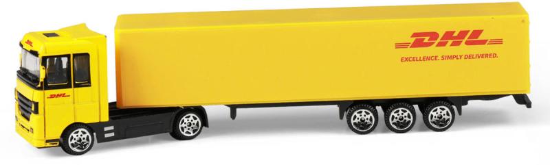 Auto kamion DHL Přepravní služba, tahač kovový s návěsem, volný chod, velikost 20cm.Pořiď si tento originální kamion s logem přepravní společnosti DHL a rozšiř si tímto svůj vozový park! Model kamionu 1:87 je vyroben z kovu, přívěs je vyroben z PVC. Model je dlouhý cca 20 cm a jezdí na volný chod. Tahle unikátní hračka nadchne všechny kluky, tak obohať svou sbírku o tento parádní kousek!