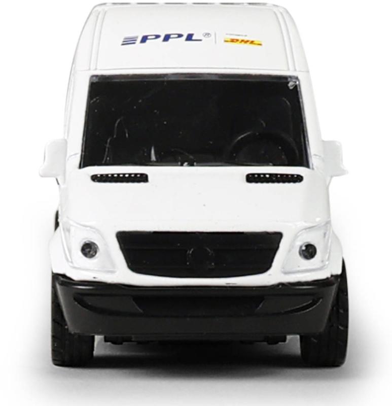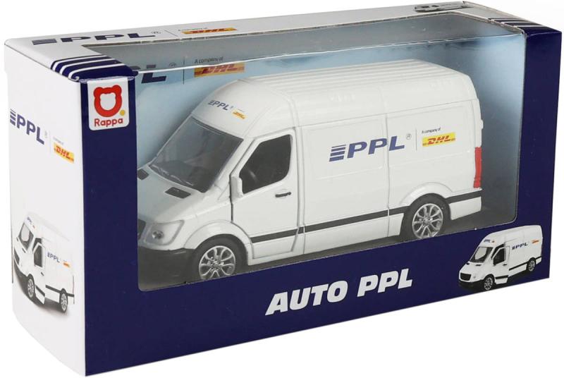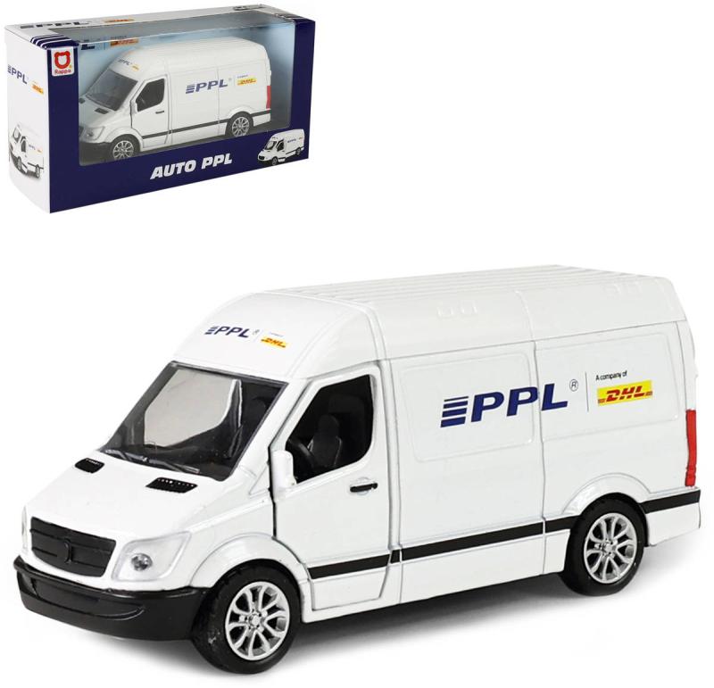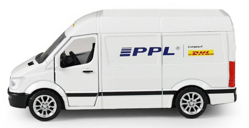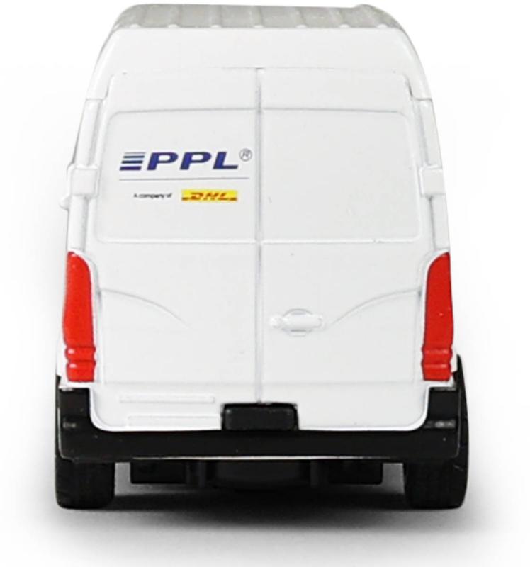 Auto kovová dodávka, přepravní společnost PPL (DHL) s pohonem na zpětný chod. Velikost 12cm.Rozšiř si svůj vozový park a pořiď si tuhle originální kovovou dodávku s logem přepravní společnosti PPL. Auto má otevírací přední dveře. Jezdí na zpětný chod a jeho délka je 12cm.