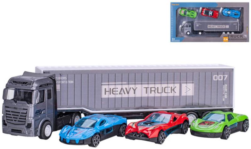 Kovový herní set přeprava aut. Součástí kamion a 3 sportovní auta s pohonem na volný chod. Velikost vozidel 22 / 7cm.Autíčka - hračka, která fascinuje děti všech věkových kategorií. Od realistických modelů sportovních vozů až po různá vozítka, auta stimulují kreativitu a umožňují dětem prožít vlastní dobrodružství. Jsou ideální nejen pro zábavné hry, ale také pro rozvoj jemné motoriky, koordinace očí a rukou a prostorového myšlení. Hledáte-li dokonalý dárek pro malé motoristické nadšence, autíčka jsou jasnou volbou.