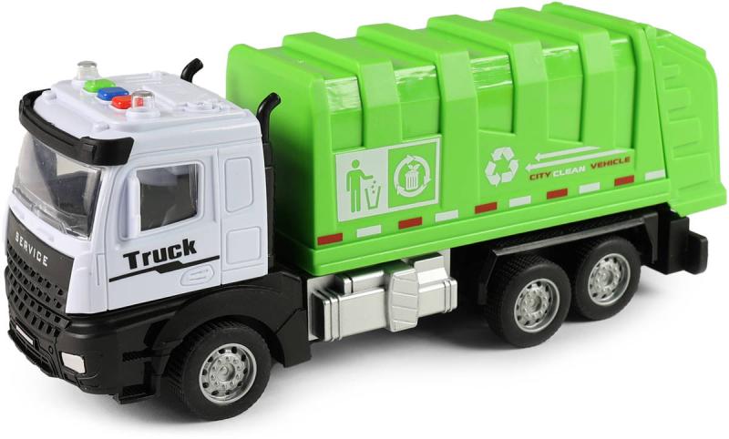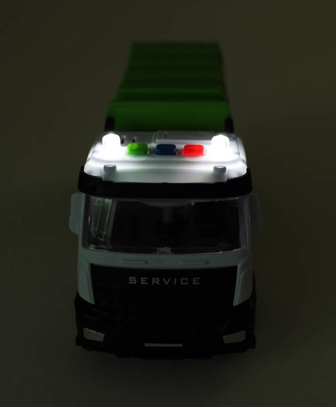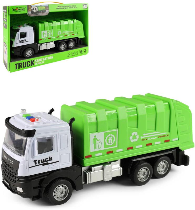 Zelené plastové popelářské vozidlo, auto svoz komunálního odpadu o velikosti 25cm, s pohonem na setrvačník. Hračka na baterie, se světlem a zvukem.Toto realisticky zpracované popelářské auto potěší každého malého milovníka techniky! Auto je vybaveno světelnými a zvukovými efekty, které se spustí stisknutím tlačítka. Díky pohonu na setrvačník stačí auto postrčit a samo dojede. Délka vozidla je přibližně 25cm, což z něj dělá ideální velikost pro hru doma i venku. Výrobek obsahuje 3ks baterií typu AG13, které jsou potřeba pro zvukový i světelný efekt, baterie jsou součástí.