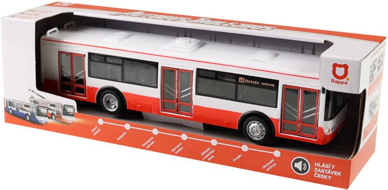 Červený plastový autobus městská hromadná doprava MHD na zpětný chod, velikost 28cm, hlásí zastávky česky, hračka na baterie, se světlem a zvukem.