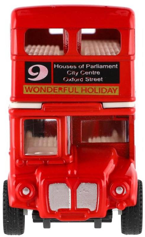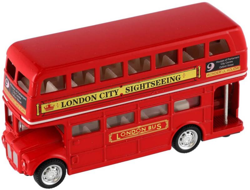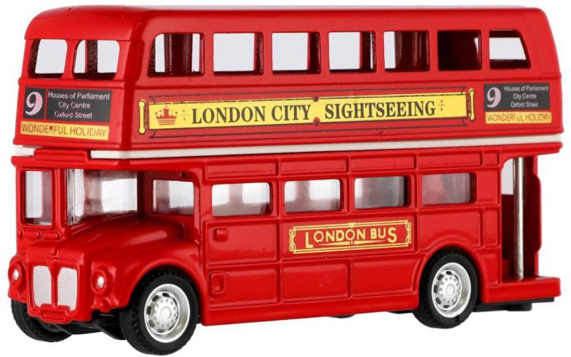 Londýnský červený patrový vyhlídkový autobus doubledecker, kovový model o velikosti 12cm, s pohonem na zpětný chod.Ocitněte se v kouzelném Londýně díky tomuto typickému červenému autobusu. Tento dvoupatrový autobus s uzavřenou střechou vás doveze kamkoli.