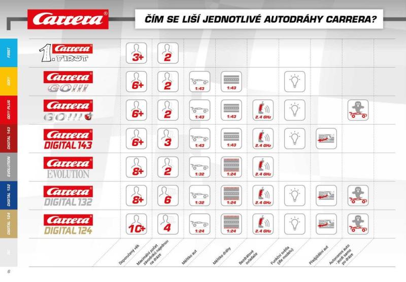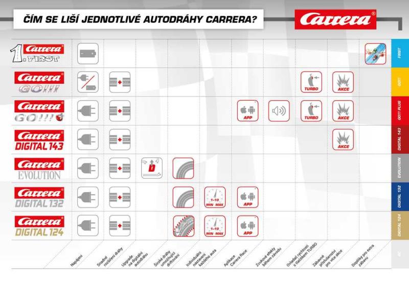 CARRERA znamená v španielčine pretek a jedno Vám môžeme zaručiť. Akonáhle rozbalíte krabicu s logom Carrera, rozprúdi sa Vaša pretekárska krv na najvyššie otáčky a je jedno na akom okruhu a s akým autom budete práve pretekať. Tento pocit zažívajú tisíce fanúšikov už od roku 1963, kedy značka Carrera uzrela svoju prvú pretekársku trať. Počas nasledujúcich viac než štyridsiatich rokov, sa Carrera prebojovala až na úplnú špičku v oblasti autodráh, áut a ich príslušenstva. Dnes ponúka produkty najvyššej kvality, ktoré sú určené nielen deťom ale aj dospelým, pre ktorých sa autodráhy stali hobby na celý život.