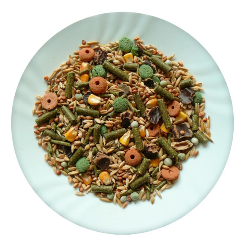 Složení: Vojtěška, pšenice, ječmen, čirok, extrudované obiloviny, kukuřice, oves, hrachové vločky, svatojánský chléb, ječné vločky, pšeničné vločky.