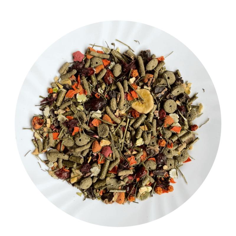 Složení: Vojtěška, ovoce (šípky, jeřabiny, jablka, rozinky, banán), hrachové vločky, extrudovaná kukuřičná mouka, extrudovaná pšeničná mouka, svatojánský chléb, zelenina (mrkev, petržel), extrudovaná hrachová mouka, jablečná vláknina, bylinky.