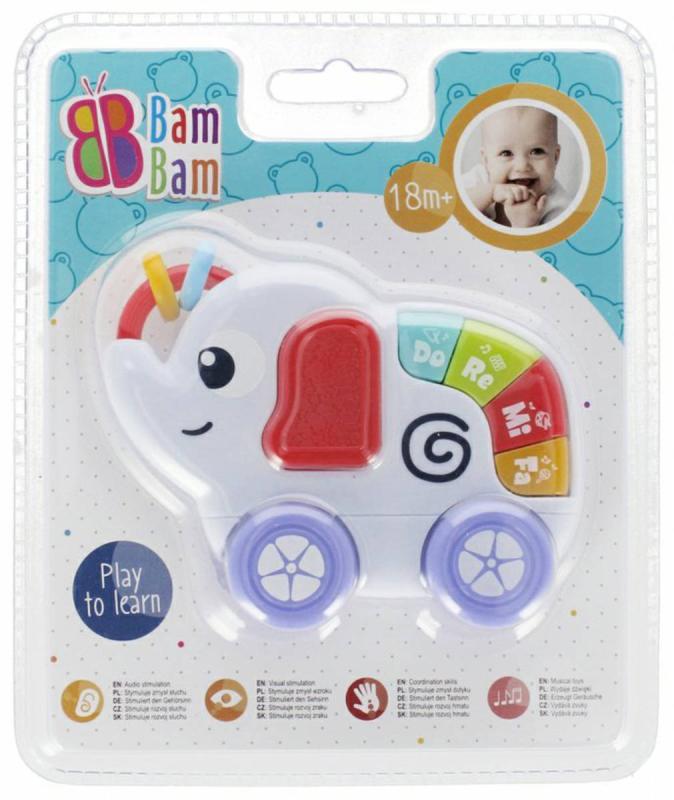 Interaktivní hudební hračka zavede vaše batole do světa hudebních zážitků a nabídne mu různé melodie, zvuky a písničky. Stisknutí kláves umístěných na hřbetě zvířete způsobí, že barevná ušní světla blikají v rytmu melodie, čímž se hra stává atraktivnější. Díky možnosti samostatného výběru tlačítka se batole učí rozlišovat zvuky, pamatovat si je, logickou posloupnost příčiny a následku a zároveň stimuluje smysly, manuální zručnost a motoriku. Díky kolečkům lze hračku používat i jako malé auto. Hračka má také pohyblivé prvky, které upoutají pozornost dítěte: na sloním chobotu spojeném malou čelenkou jsou dvě malé kuličky, které při hře půvabně chrastí.