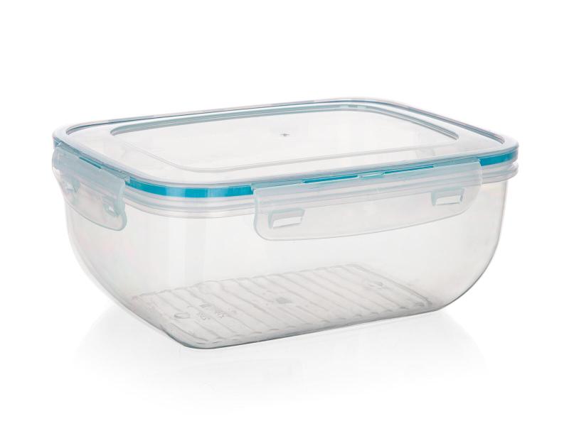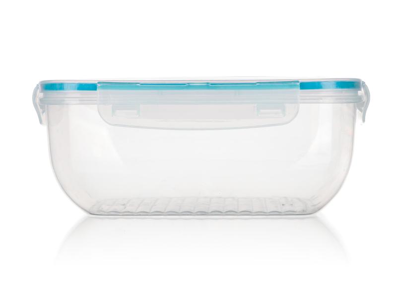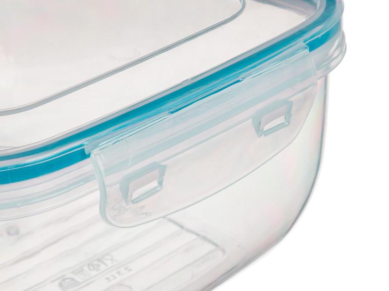 Sada plastových dóz na potraviny LEYA, s tyrkysovým silikonovým těsněním, zajišťuje vzduchotěsnost dózy.