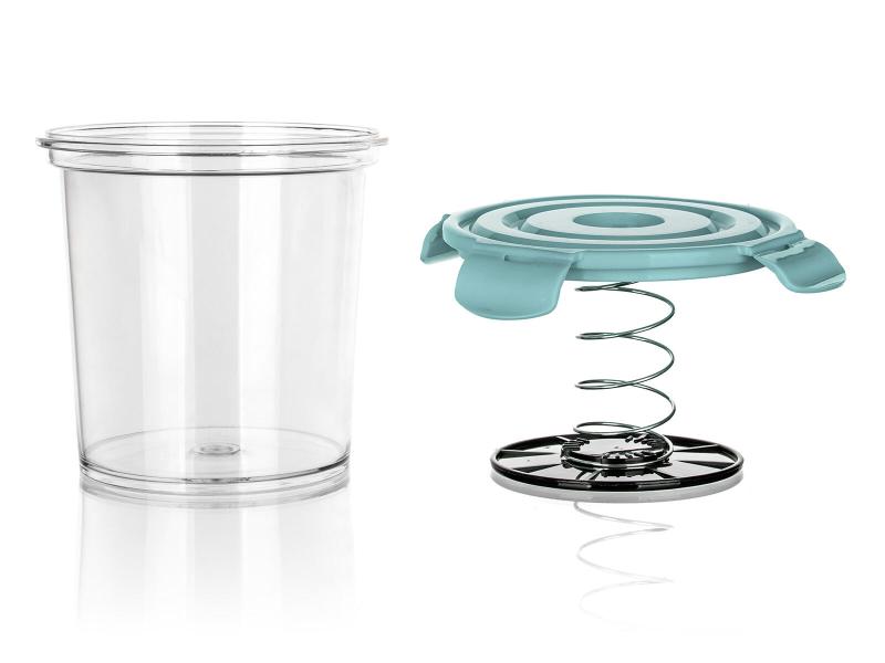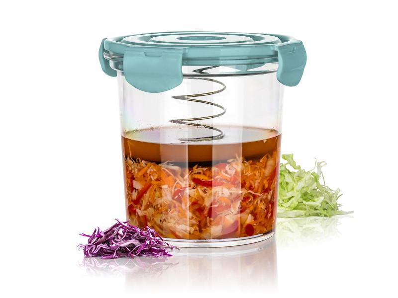 Použití je jednoduché: potraviny vložte do nádoby a zalijte je vodou nebo lákem podle receptu. Víko s klipy a pružinou pevně přitlačí potraviny, čímž se výrazně omezuje kontakt se vzduchem a tím i riziko nežádoucího zkažení.