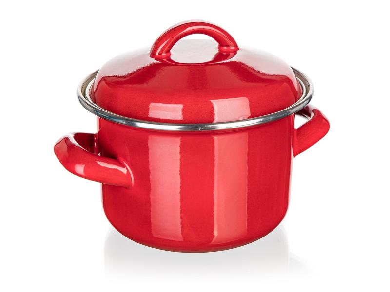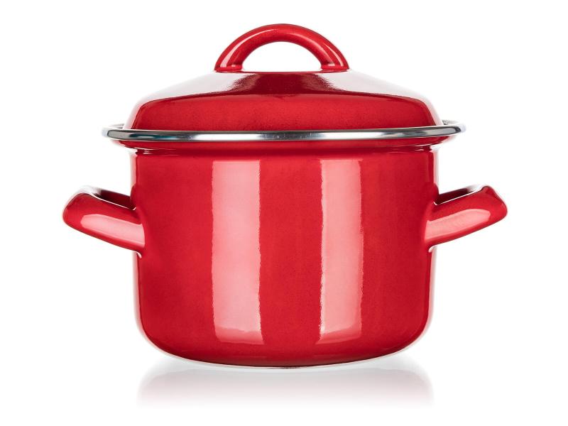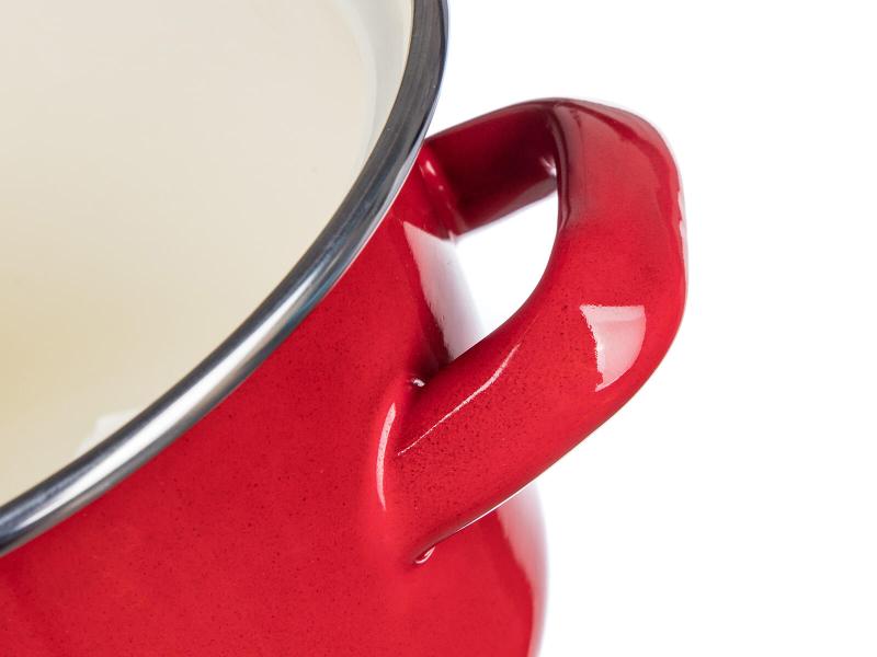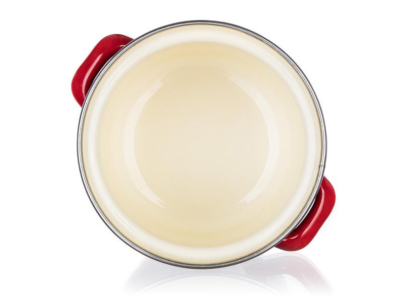 Poklice i hrnec s červenou smaltovanou glazurou, černým dnem na vnější straně, s krémovou barvou na vnitřní straně.