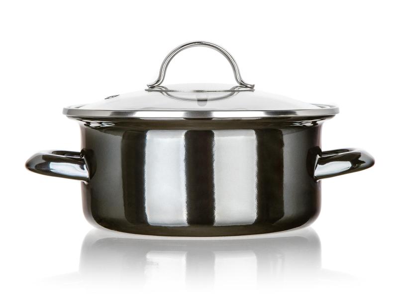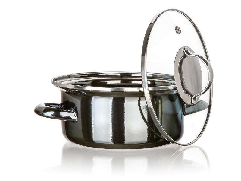 Smaltovaný hrnec s průměrem 18 cm a objemem 1,3 l je vhodný na všechny typy varných desek včetně indukce, doplněný o praktickou skleněnou poklici.