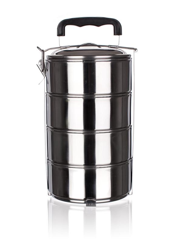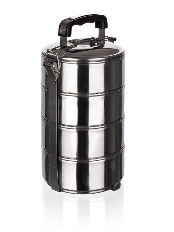 Nerezový jídlonosič o průměru 13 cm s 4 díly a spolehlivým uzávěrem na sponu pro bezpečný přenos jídel.Tento nerezový jídlonosič o průměru 13 cm nabízí praktické řešení pro přenášení potravin a hotových pokrmů díky svému 4dílnému provedení a pevné sponě, která zajistí bezpečné uzavření celé sady.