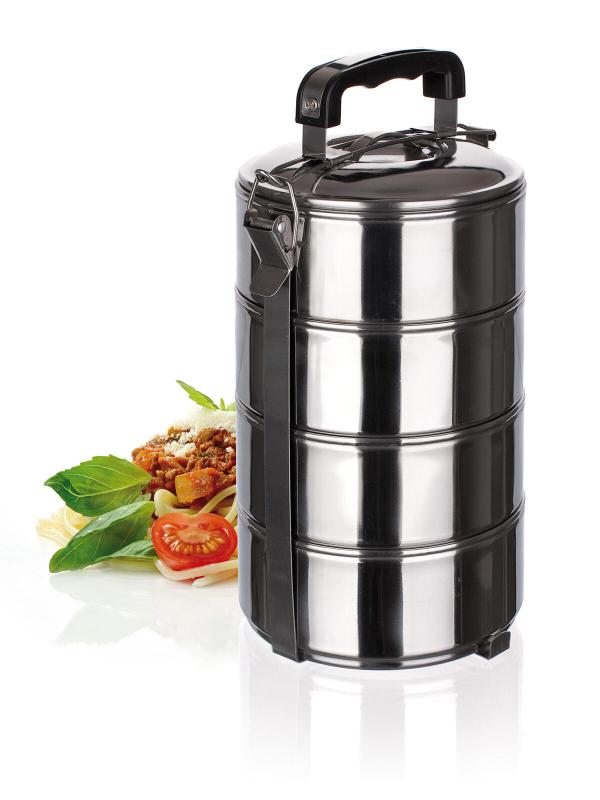Tento nerezový jídlonosič o průměru 13 cm nabízí praktické řešení pro přenášení potravin a hotových pokrmů díky svému 4dílnému provedení a pevné sponě, která zajistí bezpečné uzavření celé sady.