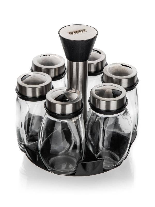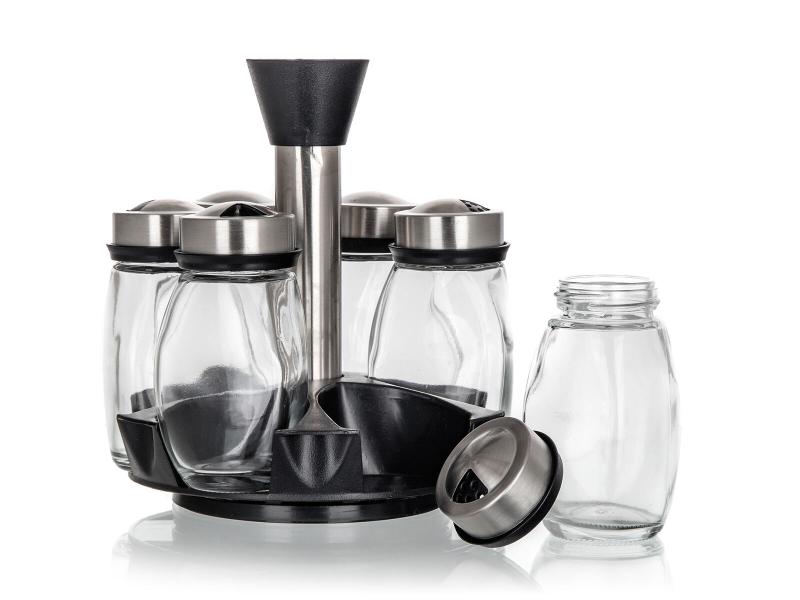 Sada obsahuje šest skleněných kořenek s objemem 120 ml a jeden plastový ABS otočný stojan, který usnadňuje přístup ke koření.