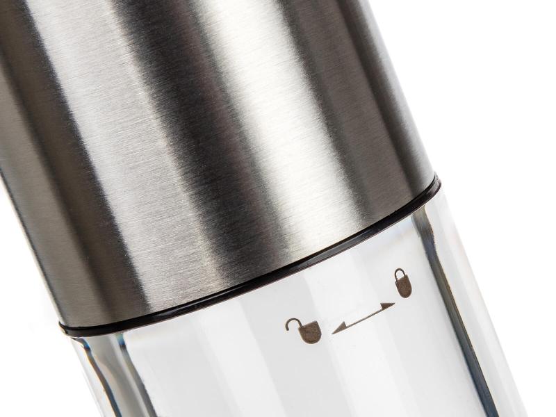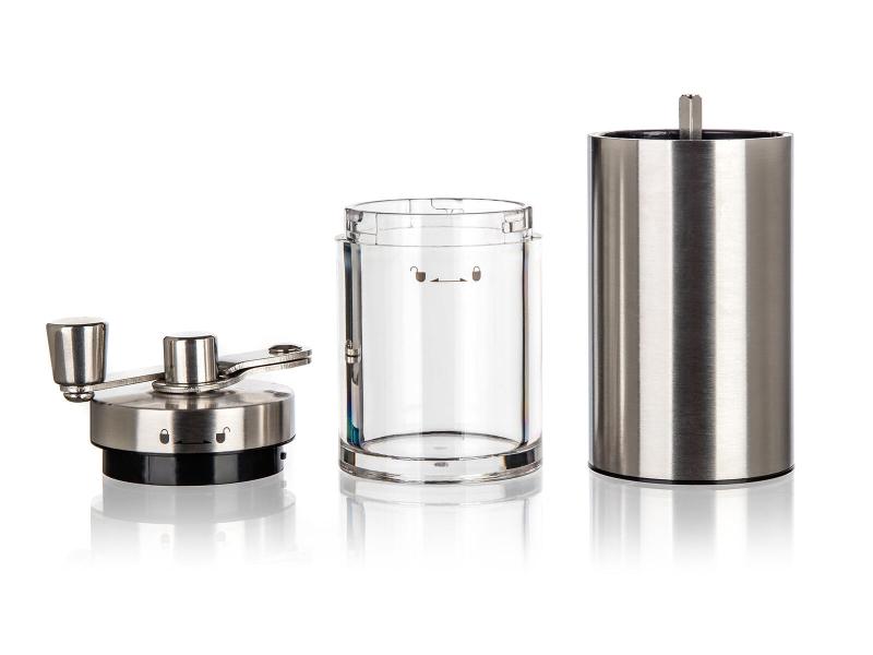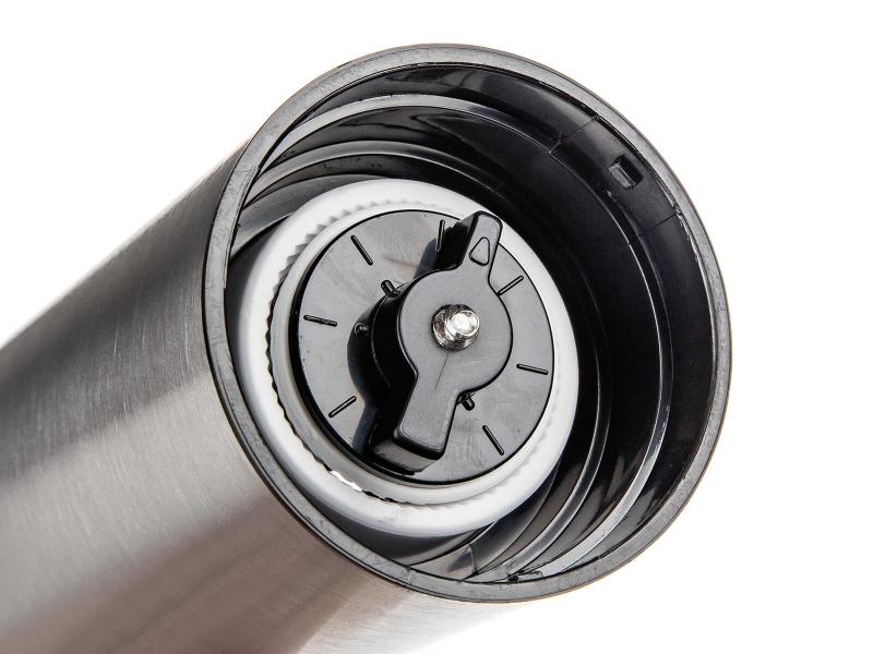 Jeho výška je 18 cm a průměr 5 cm, což zajišťuje kompaktní rozměry vhodné pro snadné umístění a manipulaci. Celý mlýnek je vyroben z odolné nerezové oceli, která je snadno udržovatelná a dlouhodobě zachovává svůj vzhled.