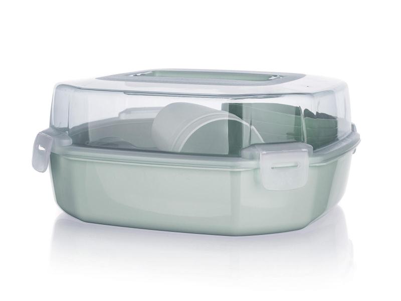 Sada obsahuje 26 dielov praktického plastového riadu v mint farbe, ideálna na kempovanie a vonkajšie aktivity, všetko uložené v praktickej dóze.
