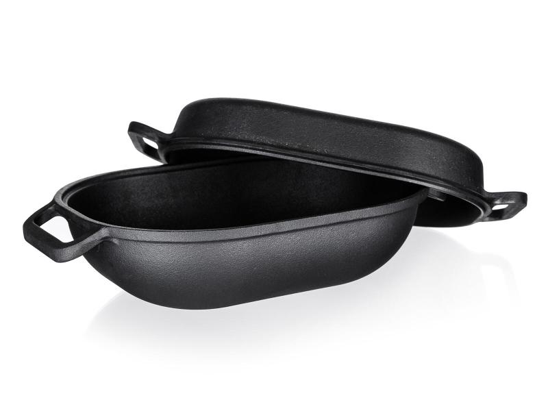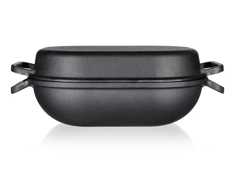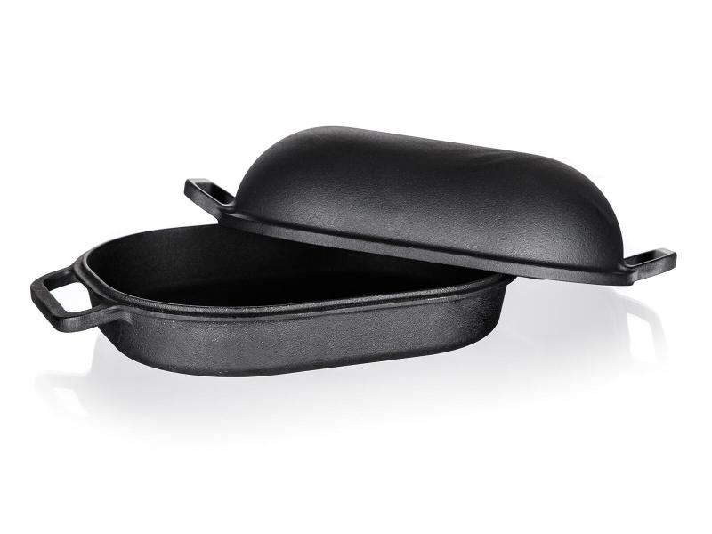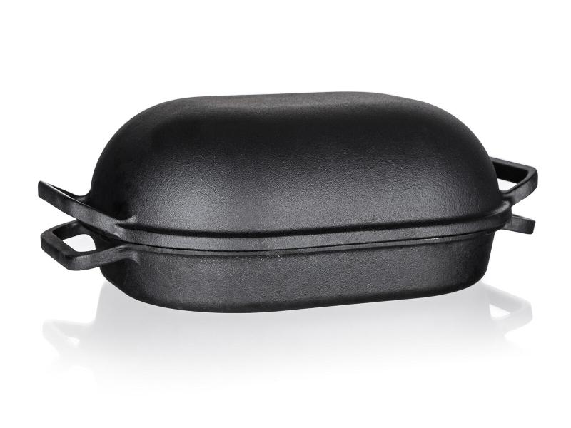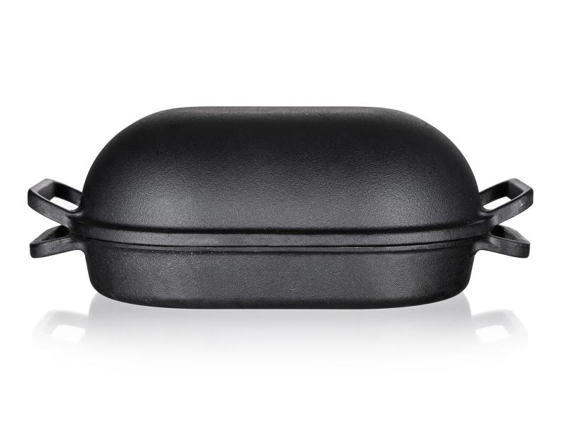 Pekáč s poklicí v rozměru 39 x 26 x 14 cm a objemu 3 + 4 litry je vyroben z kvalitní litiny v elegantní černé barvě.
