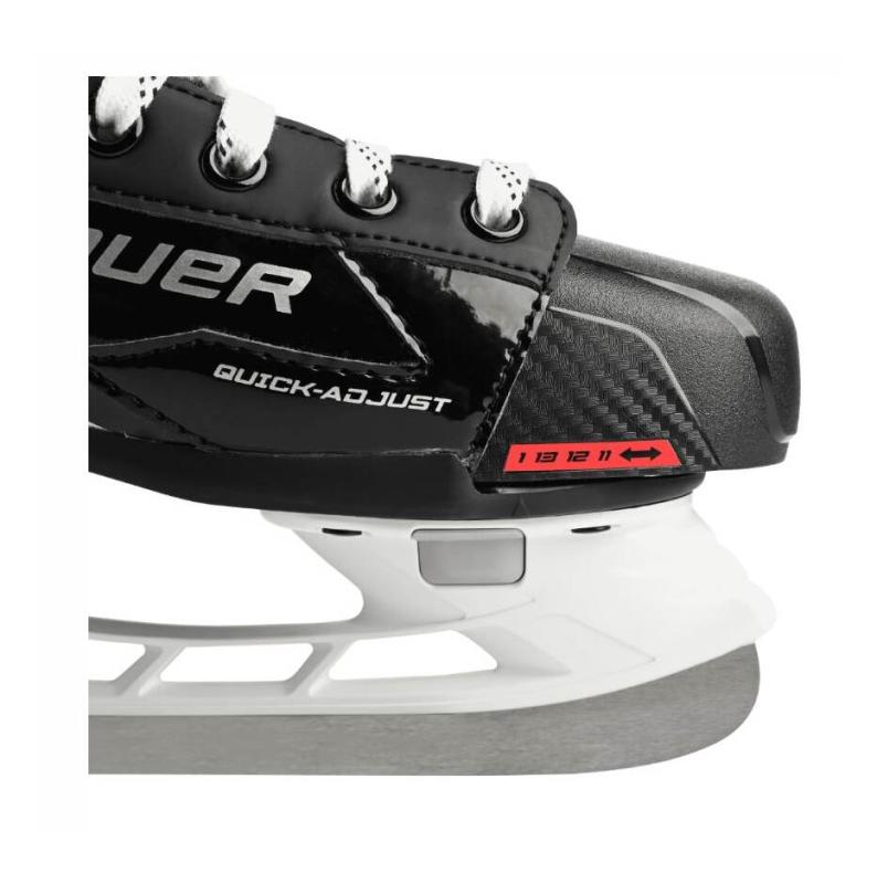Tradiční systém zavazování s očky umožňuje snadné a pevné utažení bruslí podle potřeby. Nastavitelná krytka prstů umožňuje měnit velikost brusle, což je praktické při rychlém růstu nohy dítěte.