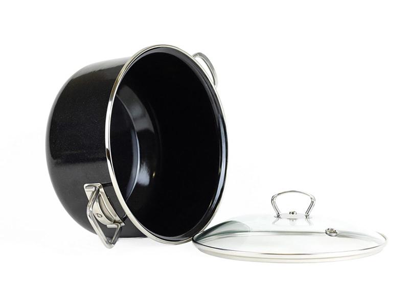 Nádobí ze silného 2 mm plechu s kvalitním a odolným smaltem skvěle doplňuje elegantní nerezové kování a skleněná poklice s vylepšeným otvorem pro únik přebitečné páry.