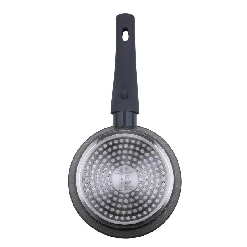 •16x7,5 cm rendlík bez pokličky. •Kapacita: 1,6L. •Materiál: kovaný hliník. •Nepřilnavý hrnec: má mramorovaný nepřilnavý povrch. •Vhodné pro všechny typy sporáků včetně indukce. • Ergonomická rukojeť s měkkým povrchem a texturou hadí kůže. • Šedé provedení s bílými puntíky. • Bez obsahu PFOA. •Péče: Pro prodloužení životnosti výrobku se doporučuje ruční mytí.Pánev bez pokličky patřící do kolekce Orion značky Bergner. Jeho velikost, 16 cm v průměru a 7,5 cm na výšku, a jeho objem 1,6 l z něj dělají ideální pro přípravu jakéhokoli typu individuálních receptů nebo pro dvě osoby a překvapí vaši rodinu a přátele širokou nabídkou jídel. Hrnec je vyroben z kovaného hliníku, vysoce kvalitního a odolného materiálu, který umožňuje rychlé a rovnoměrné rozložení tepla, zabraňuje vzniku horkých míst a tím šetří velké množství energie. Tento materiál navíc poskytuje kusu velmi dobré vlastnosti lehkosti, udržení tepla při vysokých teplotách a odolnosti vůči rizikům koroze, nárazům a poškrábání. Hrnec má nepřilnavou vnitřní vrstvu Marble+, která zajišťuje rovnoměrnější efekt uvolňování potravin, zabraňuje přilnutí jídla k povrchu a usnadňuje čištění. Tento povlak je navíc extrémně odolný a odolný proti poškrábání. Hrnec má bodovou indukční základnu, díky které je vhodný pro všechny typy sporáků: sklokeramické, elektrické, halogenové, plynové a indukční. Design hrnce v šedé barvě s bílými puntíky se skvěle hodí do každého typu kuchyně. Navíc má ergonomickou rukojeť s texturou hadí kůže a povrchovou úpravou soft touch, která pozvedne váš způsob vaření a zároveň vás ochrání před popálením při manipulaci s kusem. Díky všem těmto vlastnostem je ideální pro všechny kuchaře, od začátečníků až po ty nejzkušenější. Pro prodloužení životnosti výrobku se doporučuje ruční mytí.692439204538517.47