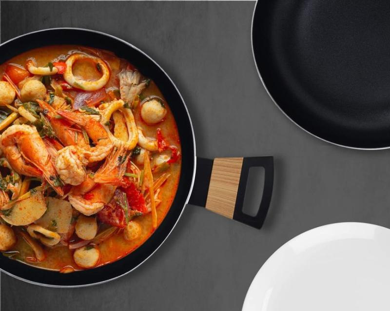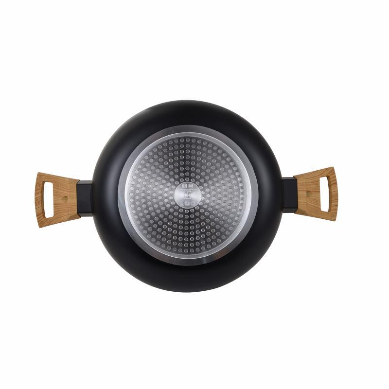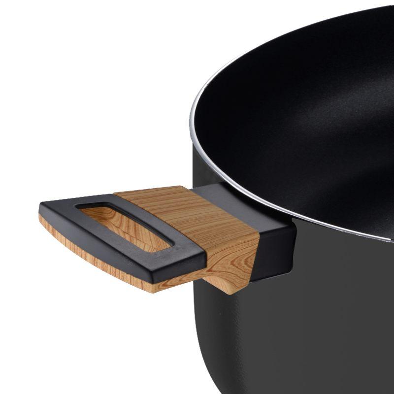 Hrnec 28 cm se skleněnou poklicí z kolekce Bergner's Earth Black je vyroben z lisovaného hliníku a zaručuje rychlý rozvod tepla. Prémiový nepřilnavý povlak ILAG je obzvláště odolný a vhodný pro každodenní použití. Vzhledem ke složení materiálu je při vaření v tomto kastrolu bez PFOA, olova nebo kadmia nutné použít pouze malé množství tuku, perfektní pro zdravé vaření. Ergonomická dřevěná rukojeť s měkkým úchopem a tepelně odolná proti popálení. Základna s indukčním bodem je vhodná pro všechny sporáky jako je indukční, plynový, sklokeramický, halogenový a elektrický. Snadno se čistí, na povrchu se nelepí potraviny a pro prodloužení životnosti výrobku se doporučuje ruční mytí.