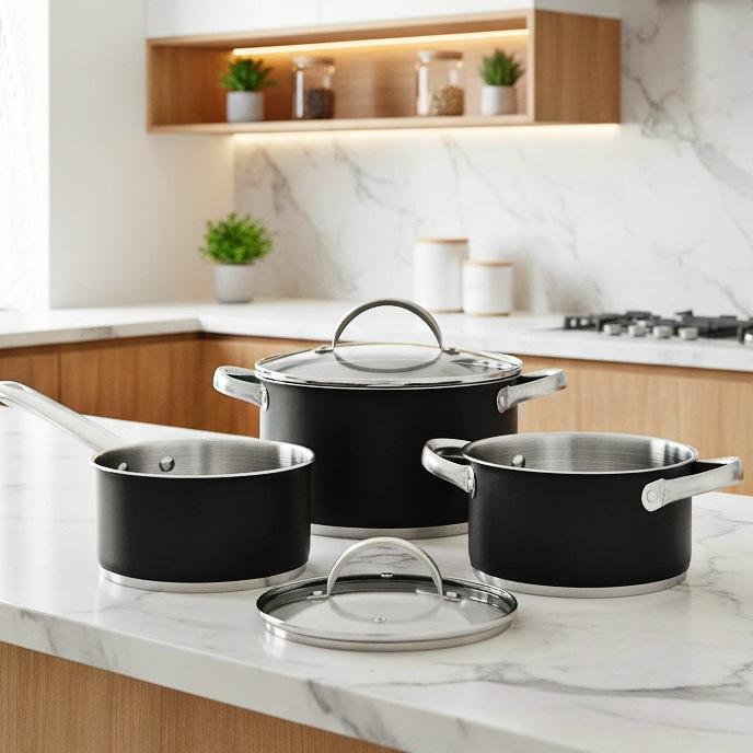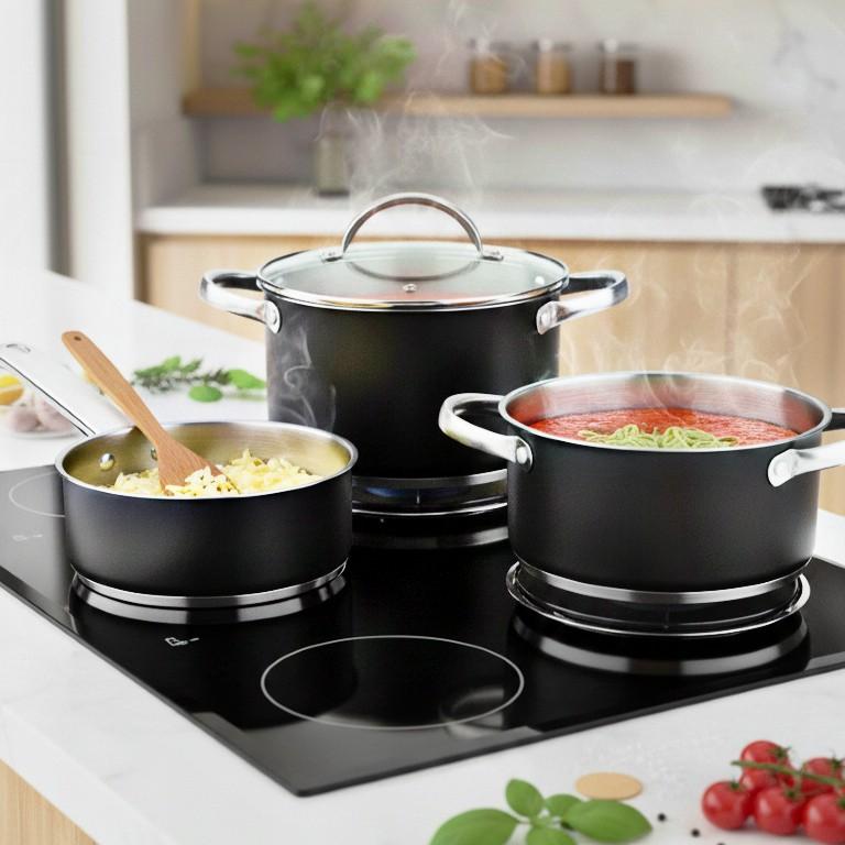 Velmi kompletní a moderní nádobí. Skládá se z 16 cm kastrolu, 20 cm kastrolu a 24 cm kastrolu. Rychlá distribuce tepla díky nerezové oceli vám umožní získat to nejlepší nádobí a ušetřit čas. Součástí jsou 2 průhledné skleněné poklice, pomocí kterých můžete bezpečně ovládat okamžité vaření. Toto nádherné nádobí si můžete vychutnat v každém z různých typů sporáků, které existují na trhu: indukční, halogenové, elektrické, plynové a sklokeramické. Doporučuje se ruční mytí.