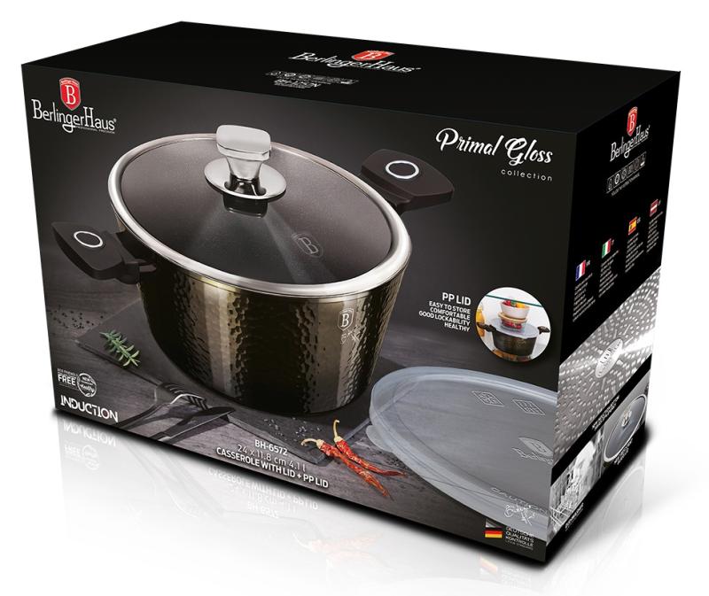 Velký kastrol s titanovým povrchem v unikátním designu Primal Gloss Collection. Součástí hrnců Primal Gloss jsou 2 poklice. Klasická skleněná poklička a navíc silikonové víko pro komfortnější užívání. Vnější tepaný vzhled kastrolu jistě zaujme každého hned na první pohled. Tepaný povrch je silnější a odolnější vůči poškození či deformaci, navíc vypadá opravdu výborně. Vnitřní vrstva je pokryta třívrstvým titanovým povrchem, který je charakteristický svou dokonalou nepřilnavostí. Připravované pokrmy se tak nepřipalují a díky tomu se kastrol velmi snadno čistí. Titanový povrch, stejně jako ostatní použité materiály, neobsahují žádné škodlivé látky, vaření je tak zcela zdravé a hygienické. Zesílené Turbo indukční dno z nerezové oceli je kompatibilní se všemi druhy sporáků a spolehlivě funguje také na indukci. Nespornou výhodou jsou také tepelně odolné rukojeti, které se při vaření nezahřívájí a zůstávájí stále chladné. Kastrol Primal Gloss je vhodný pro každodenní vaření, dušení i smažení, perfektně bude vypadat i při servírování hotových jídel přímo na váš stůl. - vnitřní i vnější vrstva neobsahují žádné škodliviny, výsledné pokrmy tak neztrácí vařením svoje vitamíny