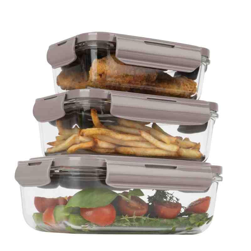 Sada tří vzduchotěsných skleněných dóz s víkem v barvě taupe, vhodných do mikrovlnné trouby i myčky, ideální pro praktické skladování potravin.
