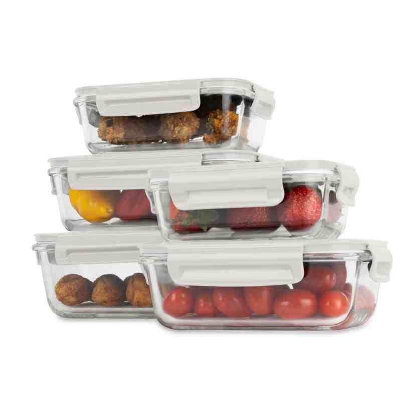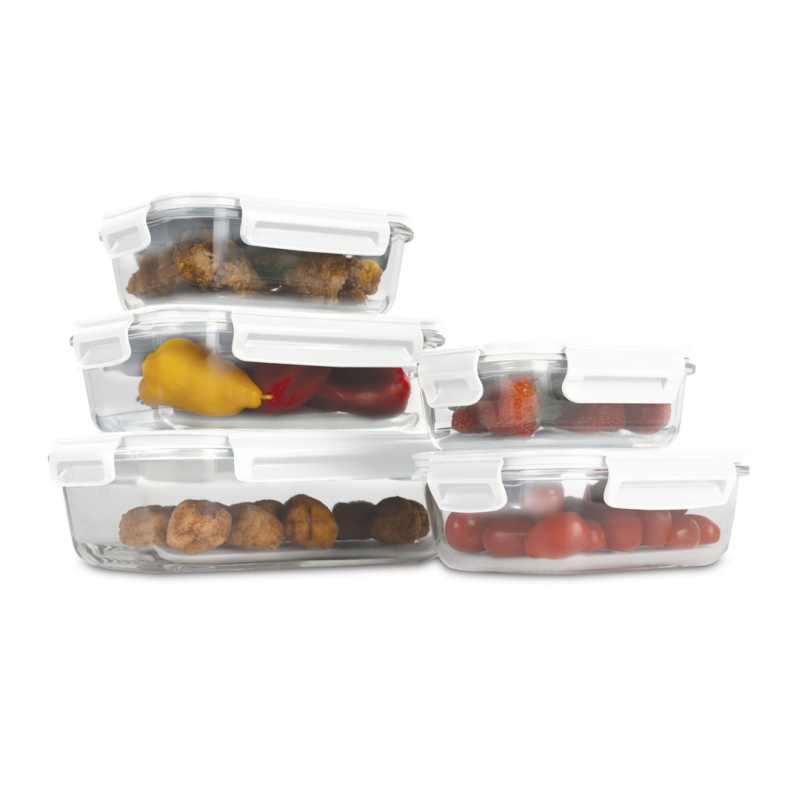 Sada pěti vzduchotěsných skleněných dóz s víky vhodných do mikrovlnné trouby, mrazničky i myčky. Praktické pro skladování a snadnou údržbu. zobrazit celý popis
