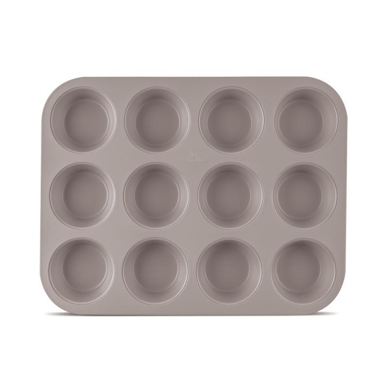 Forma na 12 muffinů s nepřilnavým povrchem titanPro usnadňuje pečení a čištění, díky těžké oceli zajistí rovnoměrné propečení těsta.Stylová a praktická forma na muffiny v elegantní matné taupe barvě představuje skvělou volbu pro všechny, kdo rádi pečou doma. Díky odolné konstrukci z uhlíkové oceli a třívrstvému nepřilnavému povrchu titanPro se muffiny snadno vyjímají a minimalizuje se potřeba tuku, což usnadňuje přípravu i údržbu.