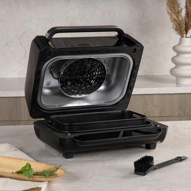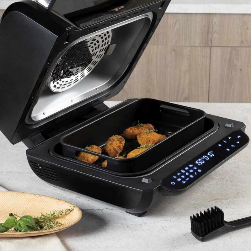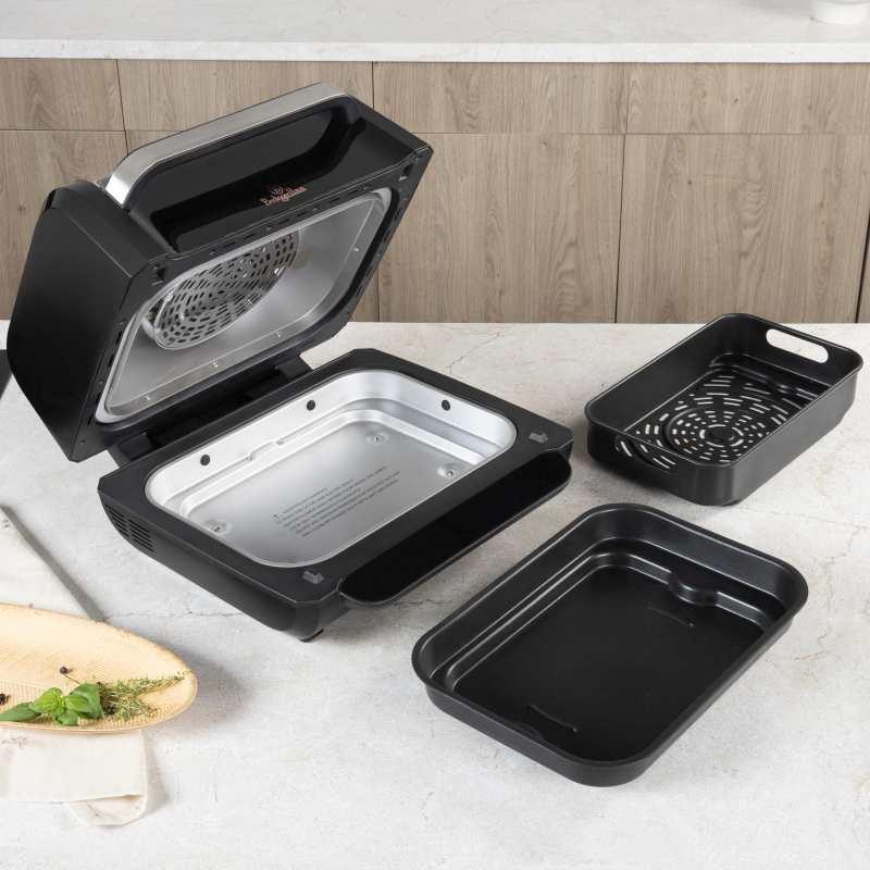 Díky horkovzdušné fritéze připravíte pokrmy s výrazně menším množstvím oleje, což přispívá k zdravějšímu stravování. Cyklonická technologie grilování zaručuje rovnoměrné opékání při teplotě až 230 °C bez vzniku kouře, což oceníte při přípravě masa i zeleniny. K dispozici jsou tři úrovně grilu – nízká, střední a vysoká intenzita – pro přesné přizpůsobení výsledku.