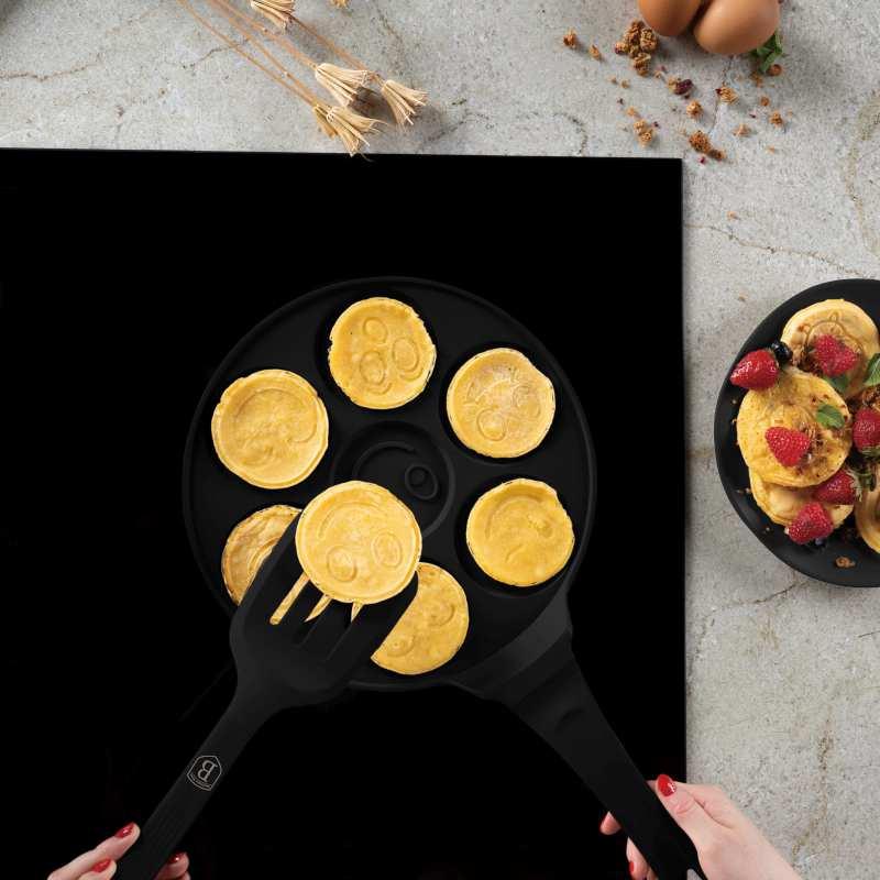 Lívanečník s titanovým nepřilnavým povrchem a indukčním dnem umožňuje snadnou přípravu palačinek s veselými emoji tvary a pohodlnou manipulaci.Tato stylová pánev na palačinky ze série Matte Black Collection nabízí 7 zábavných emoji tvarů, které zpestří každou snídani i vaření s dětmi. Díky vysoce kvalitnímu titanovému nepřilnavému povrchu a litinovému hliníkovému tělu dochází k rovnoměrnému rozložení tepla, což pomáhá připravit palačinky bez přichycení a s minimálním množstvím tuku.