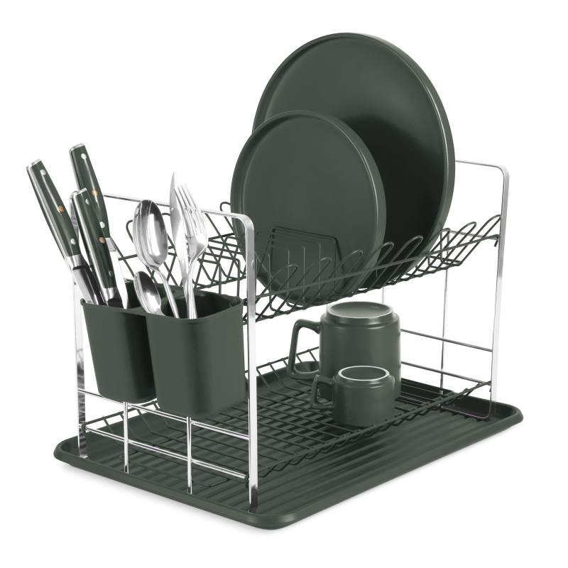 Víceúrovňový odkapávač z kombinace plastu a železa nabízí stabilitu, flexibilní uspořádání a úsporu místa v moderní matné zelené barvě.Odkapávač na nádobí představuje praktické a estetické řešení pro udržení pořádku v kuchyni