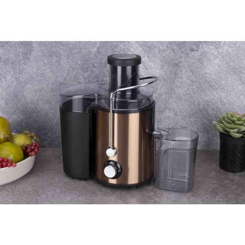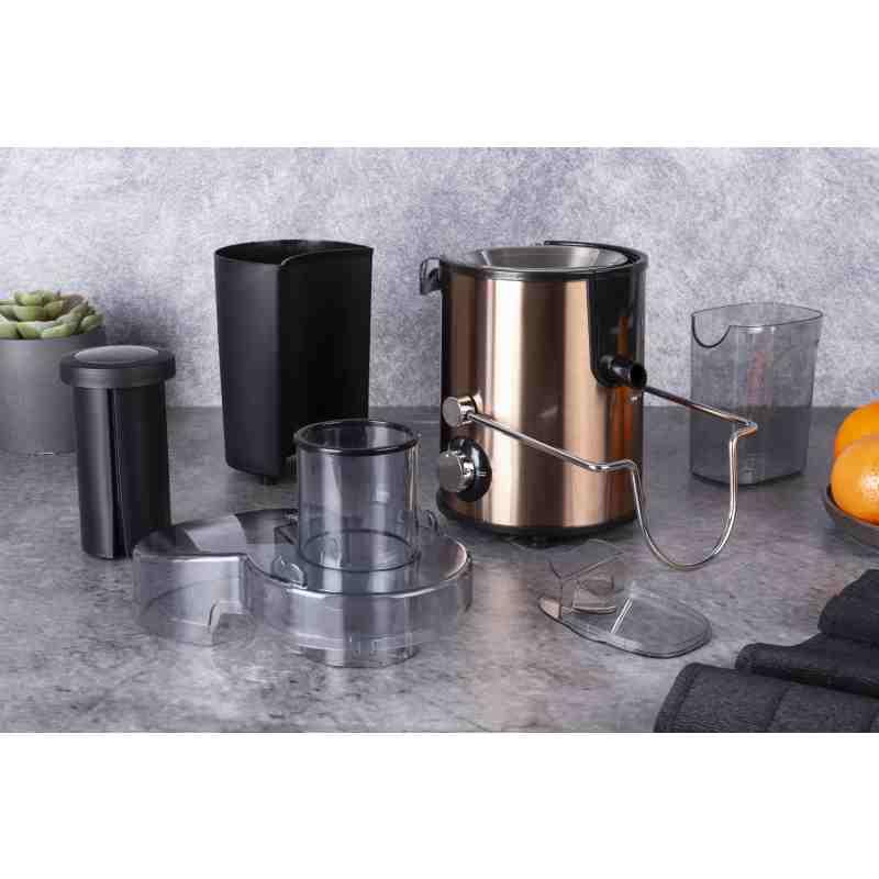 Tento odšťavňovač kombinuje odolný materiál z nerezové oceli s elegantním růžově zlatým povrchem, který ozvláštní každou kuchyň. Disponuje dvěma rychlostmi, které umožňují efektivní odšťavňování různých druhů ovoce a zeleniny podle jejich tvrdosti. Objem přiložených nádob činí 600 ml na šťávu a 1300 ml na dužinu, což umožňuje připravit větší množství nápoje najednou bez nutnosti častého vyprazdňování.