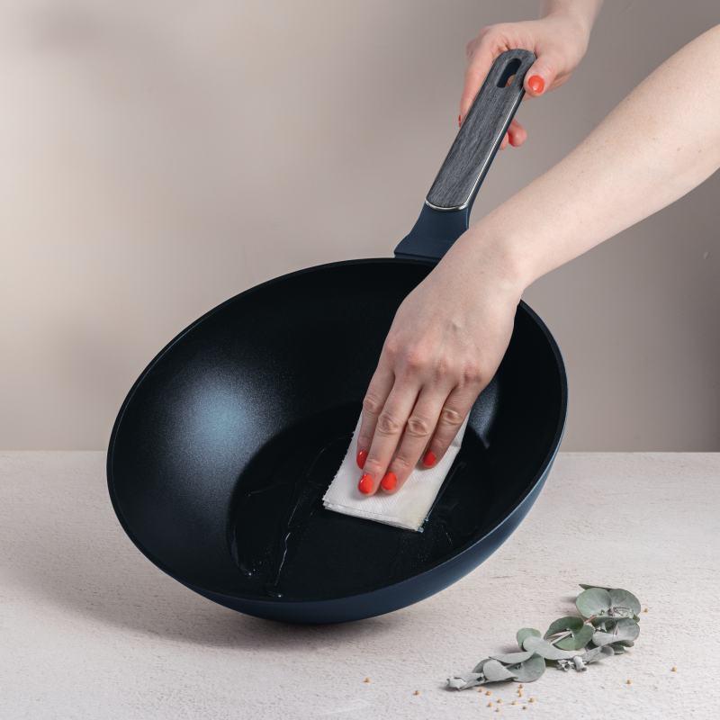 Ergonomická rukojeť s měkkým povrchem je doplněná stříbrnou vložkou a laděná do šedé dřevěné barvy. Díky tomu zůstává chladná i při vysokých teplotách, což výrazně usnadňuje manipulaci a zvyšuje bezpečnost při vaření. Design pánve je minimalistický s elegantním matným modrým povrchem, který dodá vaší kuchyni moderní a stylový vzhled.