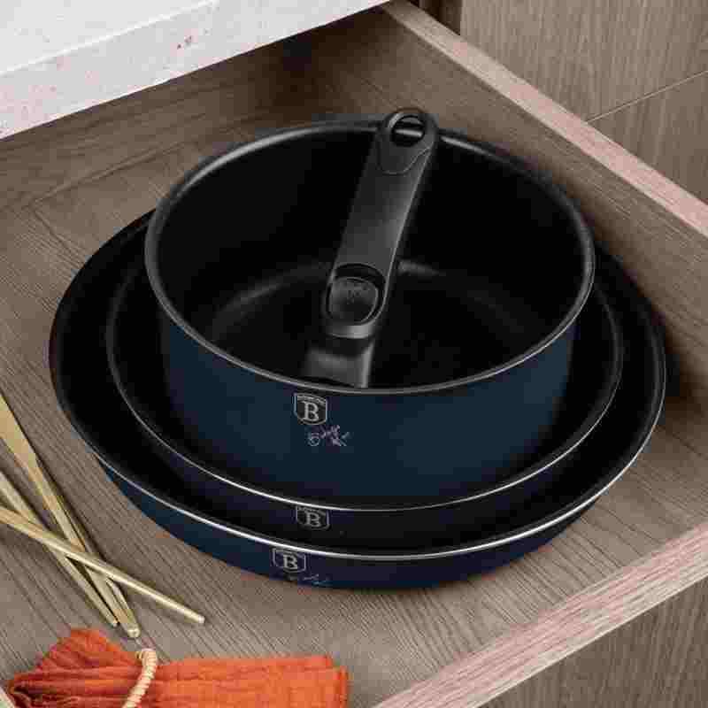 Design sady v kombinaci modré a šedé barvy s matným povrchem působí elegantně a zároveň minimalisticky, což ocení každý, kdo dbá na vzhled své kuchyně. Turbo indukční dno zajišťuje rychlé a rovnoměrné rozložení tepla, což přispívá k úspoře energie a lepším výsledkům při vaření.